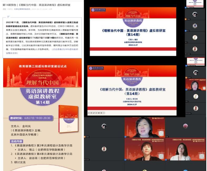 2024 年 6 月 27 日晚上 19:00 - 20:30,教育部第三批虚拟教研室——《理解当代中国:英语演讲教程》虚拟教研室第14期教研活动成功举办。本次教研活动由《理解当代中国:英语演讲教程》主编,北京外国语大学教授金利民主持,永利集团304am登录强云、谈谷雨老师受邀分别基于第3单元和第4单元的课程设计和教学示范做了汇报分享。本次活动旨在深入探讨如何依托《理解当代中国:英语演讲教程》教材优化英语教学,更好地助力新时代兼具家国情怀和国际视野的高素质国际化外语人才的培养。