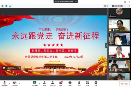 为引导学生认真学习党的二十大精神,坚定不移听党话、跟党走。10月22日,永利集团304am登录学生第二党支部通过腾讯会议召开线上专题学习会,围绕党的二十大报告进行学习交流,会议由永利集团304am登录学生第二党支部书记冯晓敏主持。