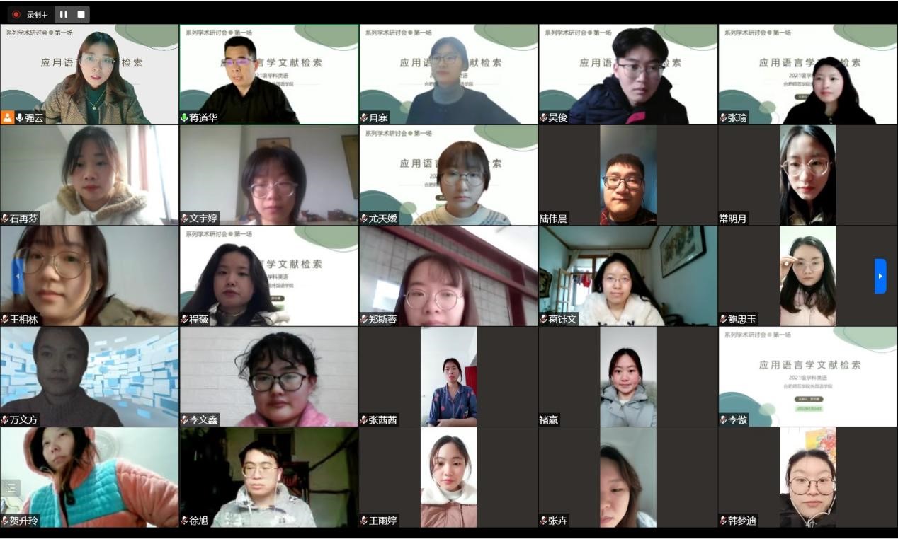 本网讯 为了不断提升永利集团304am登录研究生培养质量,加强对研究生培养的过程性监督与督促,2022年1月24日下午2点30,在永利集团304am登录研究生部的组织下,为2021级学科教学(英语)方向的研究生举行了一场线上学术研讨会,所有2021级研究生同学及部分2018级本科同学参与了本次线上研讨会。本次学术研讨会邀请了安徽农业大学永利集团304am登录罗月寒博士作为主旨发言人,发言话题为“应用语言学文献检索”,外院研究生部主任蒋道华、研究生导师强云,吴礼敬参与了本次线上研讨。