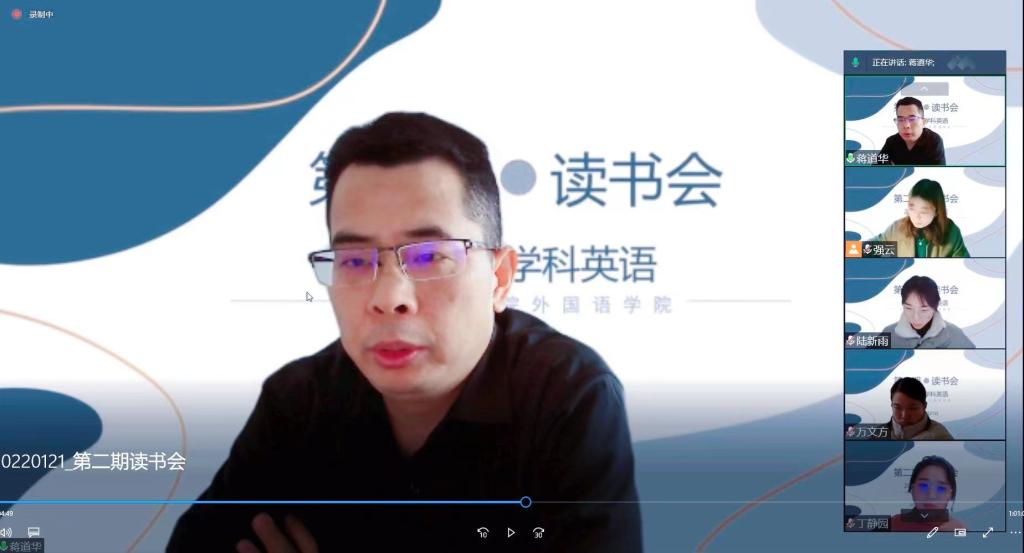 本网讯 为了强化研究生过程性培养,推动研究生专业知识与能力的不断提升,在外院研究生部的统筹下,外院部分导师组成硕士生培养共同体小组,推进硕士生读书研讨活动的开展。2022年1月21日上午9时,我院21级硕士班开展了第二次线上读书研讨会活动(寒假),部分21级教育硕士生参与该研讨会。本次读书研讨会由陆新雨、代欣宇两位同学作主旨汇报,研究生部主任蒋道华、研究生导师强云、吴礼敬指导并参与了本次研讨。