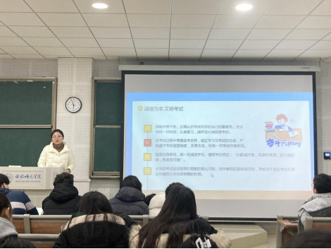 会上,冯晓敏主要围绕考试作弊的原因、考试作弊的危害、诚信考试的重要意义以及安全事项四点内容展开介绍,并通过案例分析、带领学生学习《永利集团304am登录学生考试违规处理办法》文件内容等方式,帮助学生深入了解考试违规的不良后果,引导学生牢固树立诚信考试意识,自觉遵守考试规章制度。同时,她鼓励同学们要积极备考,打有准备之仗,实事求是的考出真实水平。备考期间依旧要注意做好疫情防控,防范各类电信诈骗,保护好自身安全。
