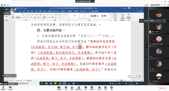 会上,英语系主任王继玲发言并强调此次见习的重要性,全体见习同学要树立从“学生”到“教师”这一身份转变的意识,并注意为人师表的行为礼仪规范;见习工作组副组长蒋道华副教授也分别介绍了师范生技能训练方案的重要注意事项,解读了见习方案的大纲要点,并在见习手册的撰写上给予细致指导;见习工作组带队教师陈英副教授介绍了线上见习平台的丰富资源,再次强调了见习的具体要求;最后,钱莉娜副主任重申了此次见习活动的主要内容,确定了见习任务的相关安排,强调了见习工作各个阶段的高标准、严要求。