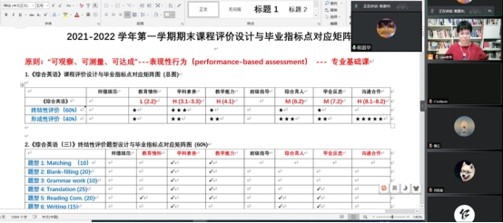 鉴于线上双平台的有效性和趣味性,会议气氛活跃,达成度高。与会教师首先采用扫码方式进行会议签到,在会议上,钱莉娜副主任分条讲解了英语师范专业毕业要求及认证标准毕业要求,并重点阐释了英语专业毕业要求指标点分解表及课程设置矩阵,强调后期制卷及修订课程标准务必对照指标点和课程矩阵。在整个讲解过程中,钱莉娜副主任同时进行了双平台实操示范,通过设置问卷、随堂练习、抢答等环节实时了解与会教师对所讲内容的掌握情况。蒋道华副教授以《综合英语》课程为例,详尽阐释指标点如何具体落实到考核的各个维度,包括形成性评价和终结性评价如何对应各个支撑点,以及平时成绩各项内容和期末试卷各个题项如何对应不同的支撑点,并提出一个关键性问题,即高阶思维能力如何体现在课程考核中,尤其是制卷中。蒋道华副教授的分享细致入微、详尽到位,与会教师纷纷表示获益匪浅。
