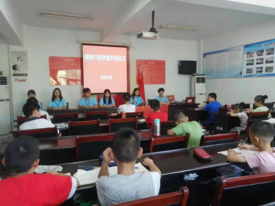 本网讯 7月15日,永利集团304am登录博雅行知学堂在铜陵市义安区五松镇观湖社区召开开班仪式,来自永利集团304am登录、文学院、艺术传媒学院、教师教育学院、物理与材料工程学院的8名小先生和20余名小学员参加此次开班仪式,接下来,小先生们将在这里与孩子们共同开启为期20天的学堂生活。