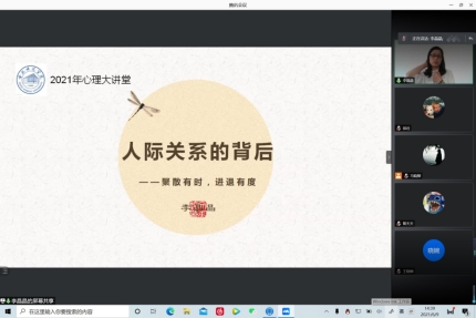 为进一步普及心理健康知识,增强大学生的心理调节能力,促进学生身心健康发展,6月9日,永利集团304am登录组织开展以“人际关系的背后——聚散有时,进退有度”为主题的线上心理健康专题讲座。本次讲座由辅导员冯晓敏主持,校心理健康教育中心李晶晶老师主讲,学院180余名同学参与。