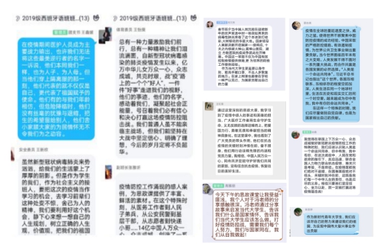 2019级英语(师范)二班的庄凯民说:“作为大学生,我们更要调整好自己的心态,把学习放在第一位。此次疫情也充分体现了我国的制度优势以及中国的大国担当。我只想说生在中国是何其的幸运。愿山河无恙,盛世安康!”