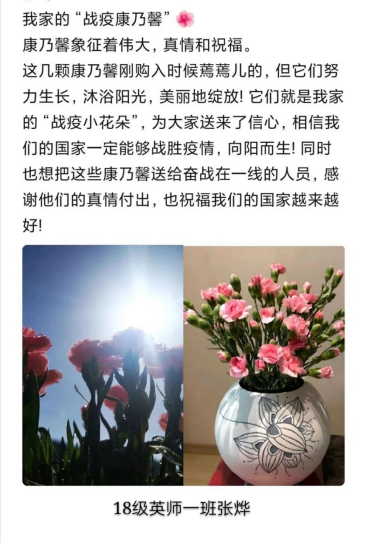 同时,还有一位让人印象深刻的作品是张烨同学的“战役康乃馨”,康乃馨的花语是“热情”“魅力”,红色的康乃馨表达了作者对一线医护人员的崇拜与感恩,预示着他们为祖国建设的热情,一定会让我们的国家越来越好,向阳而生。两位同学最后以2866票和1306票获得了第一第二的好成绩。