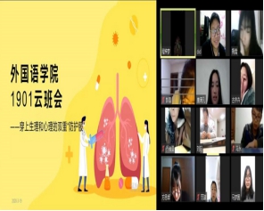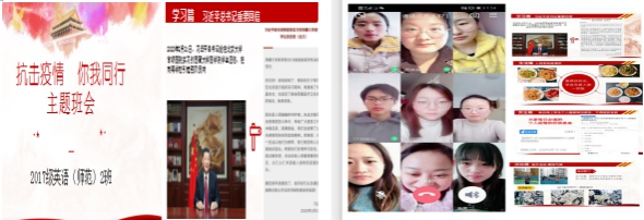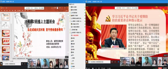 为深入贯彻习近平总书记关于疫情防控工作的重要讲话精神,进一步激发广大青年学子的责任担当,深入推进爱国主义教育,引导其为助力国家、社会和学校打赢疫情防控阻击战贡献青春力量。我院各班积极响应号召,利用线上“云”平台开展“众志成城共克时艰坚守使命服务青年”的主题班会。