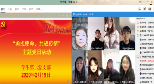 为切实强化疫情防控工作,切实发挥党支部战斗堡垒作用和党员先锋模范作用,在疫情防控阻击战的关键时期,永利集团304am登录学生第二党支部于2月19日下午线上开展“勇担使命,共战疫情”主题党日活动。本次党日活动由学生第二党支部书记周贵勤老师主持开展,支部党员参加。