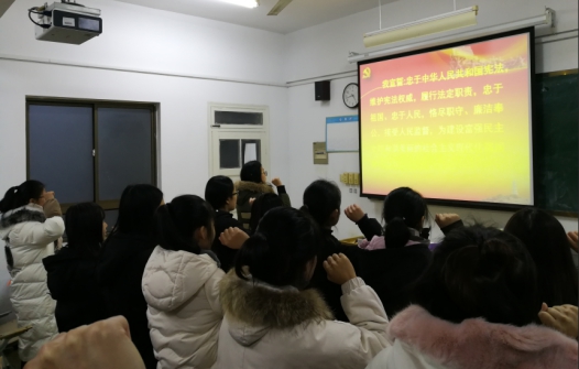 本网讯 12月10日下午,永利集团304am登录第八党支部博约楼408教室开展学宪法主题党日活动。第八党支部学生党员、入党积极分子参与了本次活动,活动由支部书记周贵勤老师主持。首先,周老师对《中华人民共和国宪法》进行了领学,就宪法的目的、实质、作用等进行解读,进一步凝聚了党员带头尊法学法守法用法的共识,要求全体党员同学把学习宣传领会党的十九大精神作为一项重要的政治内容学习,把党的十九大精神学好、学实。接着,全体党员同学在党员王南云的带领下进行了庄严的守法宣誓。