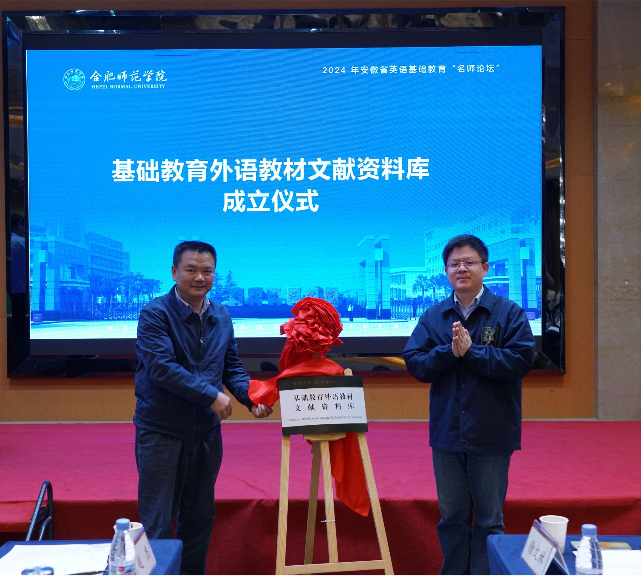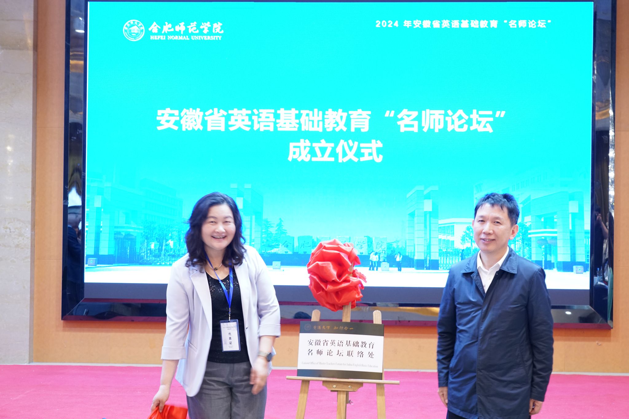 永利集团304am登录院长李可胜介绍了“名师论坛”的成立目标和运作机制,副院长吴礼敬介绍了“基础教育外语教材文献资料库”的建设规划及其预期影响。徐文林和赵杰共同为“名师论坛”联络处揭牌, 永利集团304am登录党委书记马四民与上海外语教育出版社安徽区域总经理徐杭共同为“基础外语教材文献资料库”揭牌。