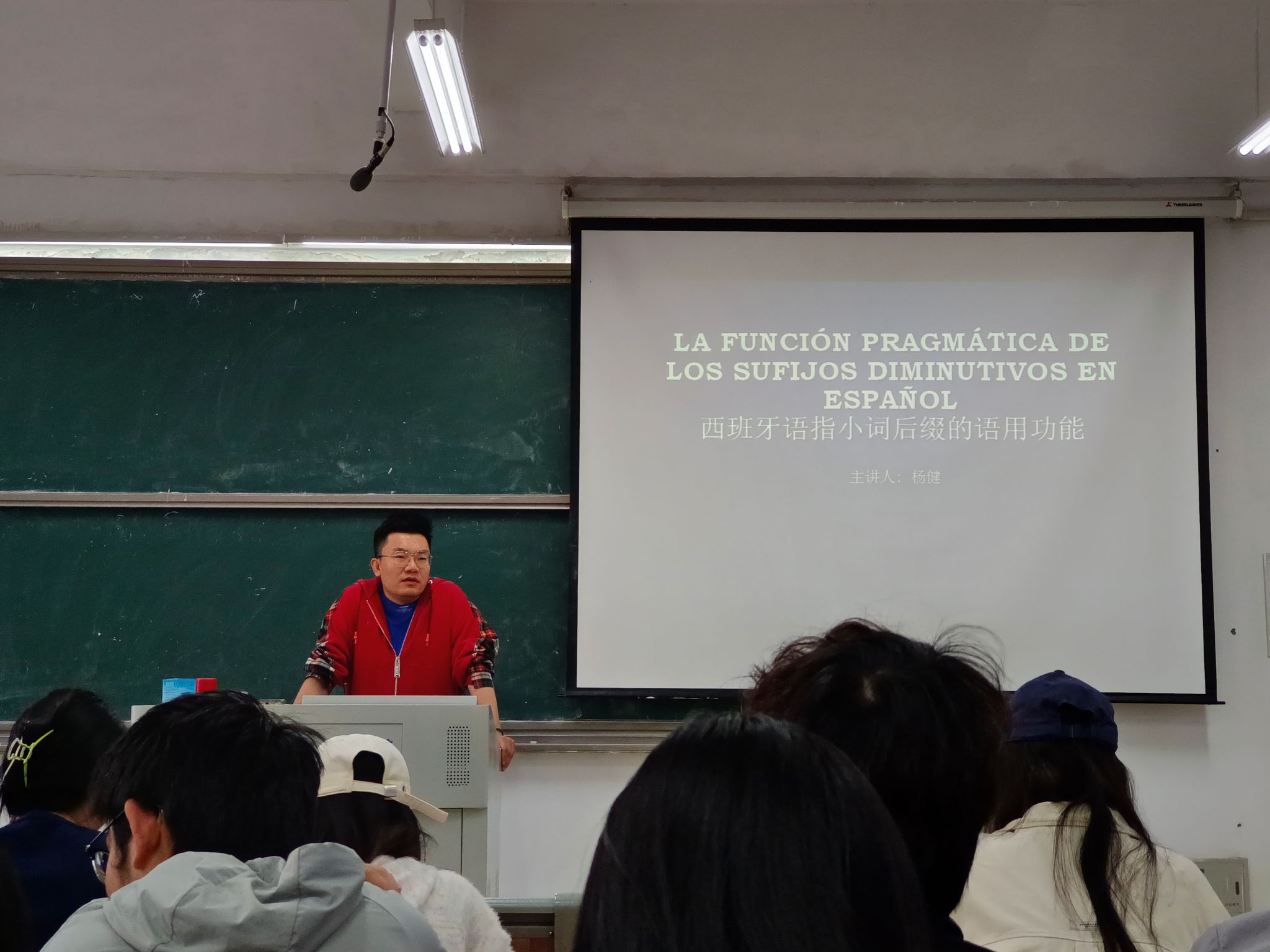 2025年4月16日下午,永利集团304am登录西班牙语专业杨健博士在博学楼A206教室,作了《西班牙语指小词后缀的语用功能》学术报告。2023级与2024级西班牙语专业学生听取了此次报告。
